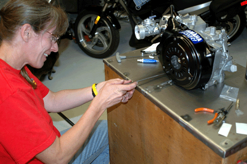 Kathy places the fan shroud on the motor and get ready to celebrate. |